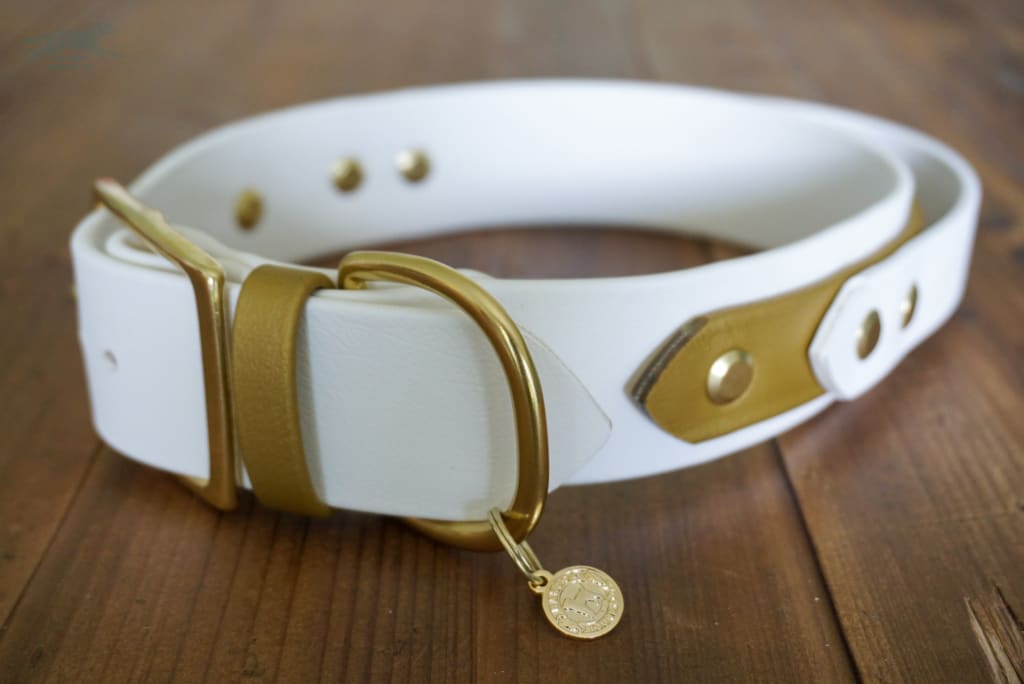 small 1/2″ brass HHco. collar charm for added style on gold and silver hardware collars.