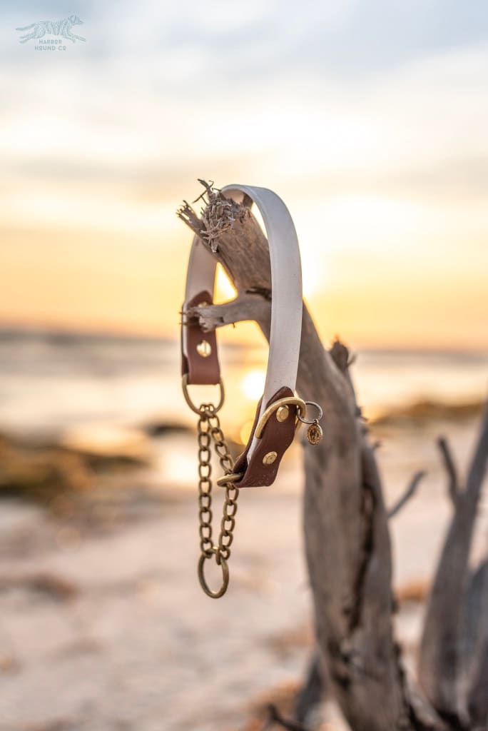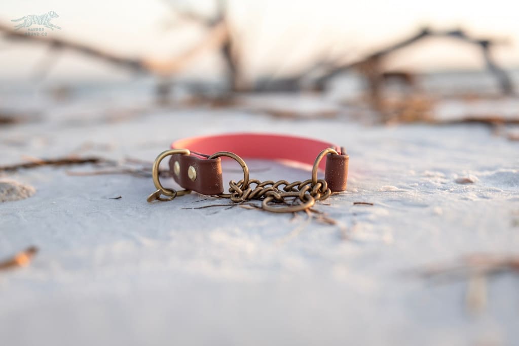 solid brass Check Chain Martingale (Gold) or Stainless-Steel Check Chain(silver), D-ring. This hardware will not rust with use in water.