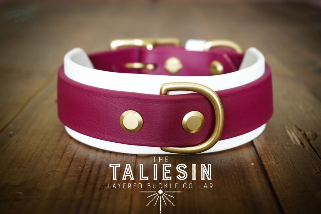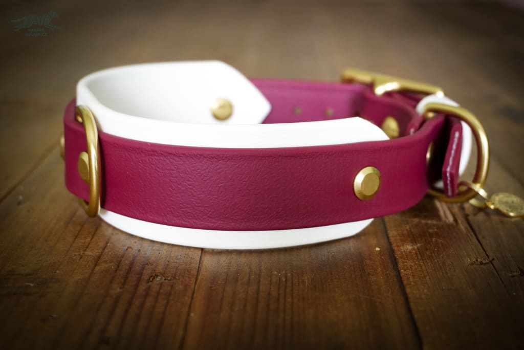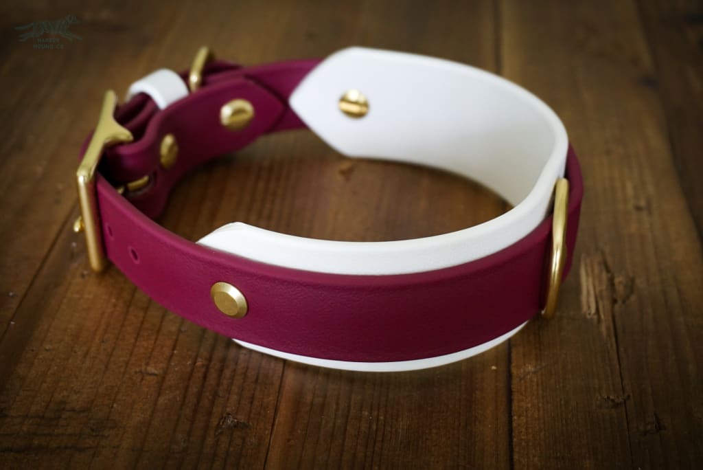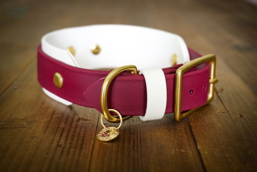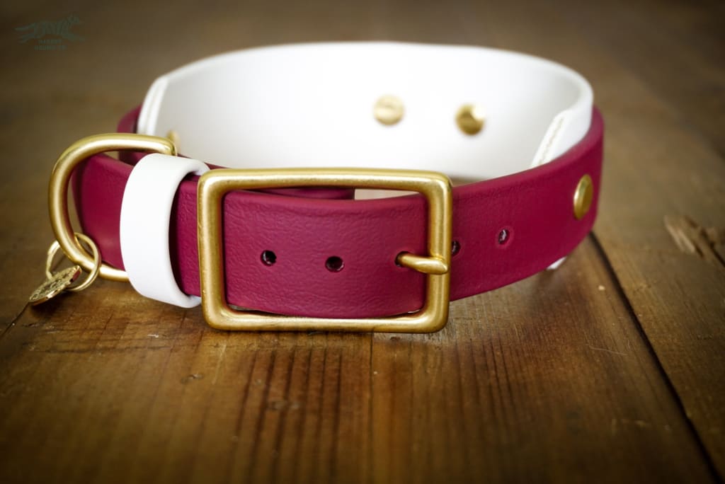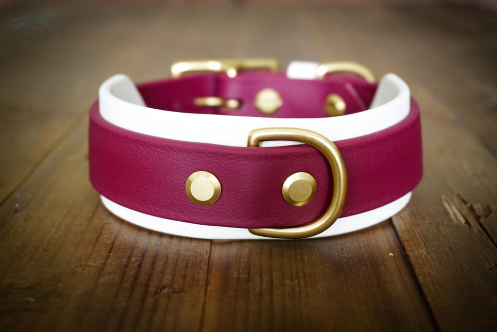 The top 1″ wide layer is the collar layer, and this is the layer that your buckle will be on. The bottom layer is a decorative 1.5″ wide webbing layer in Heavy Duty weight (approx. 4mm thick) Biothane webbing. Collar can be made with a 3/4″ top layer upon request.
