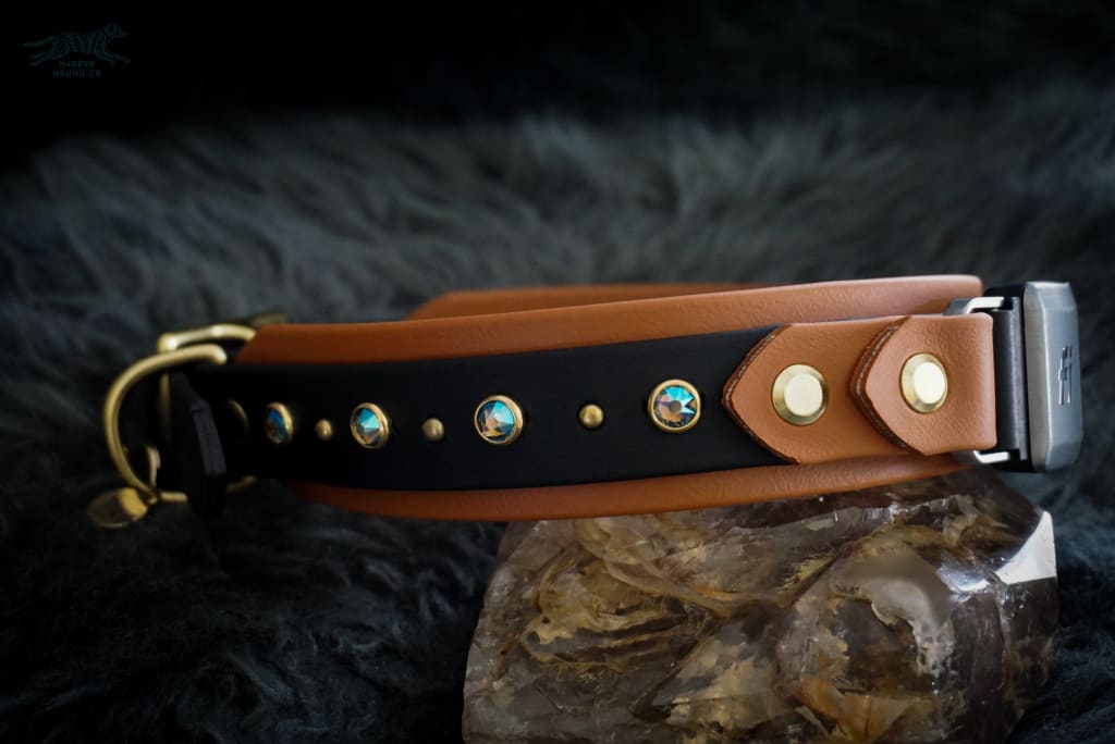 Taliesin – 1″ wide top collar layer with a 1″ buckle, this size can fit smaller necks better than the Sonali style collar. Bottom layer is a 1.5″ wide decorative layer.