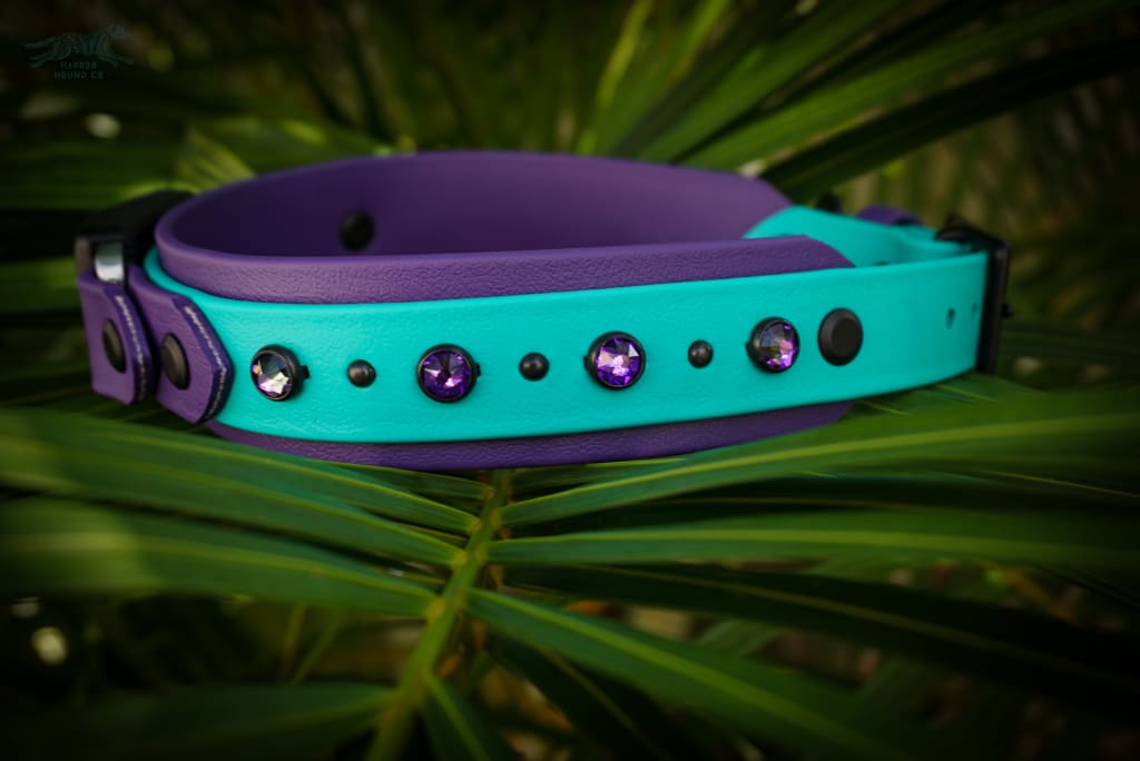 Sonali – 1.5″ wide base collar layer is the is the layer that your buckle will be on. The top layer is a decorative 1″ wide webbing layer. This style collar will fit larger necks better than the Taliesin.