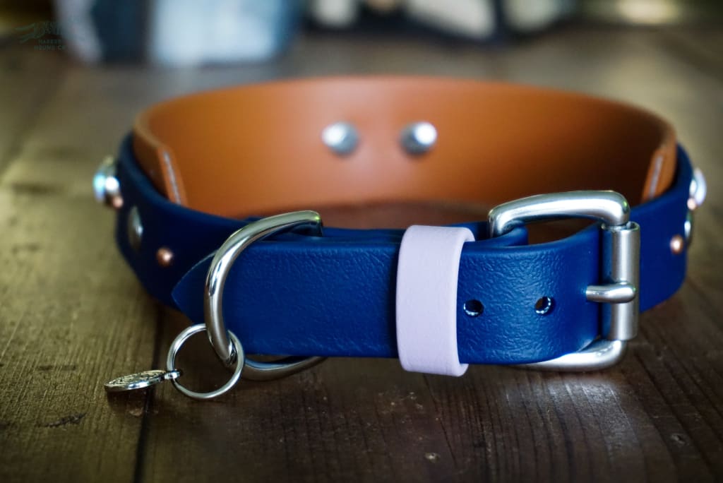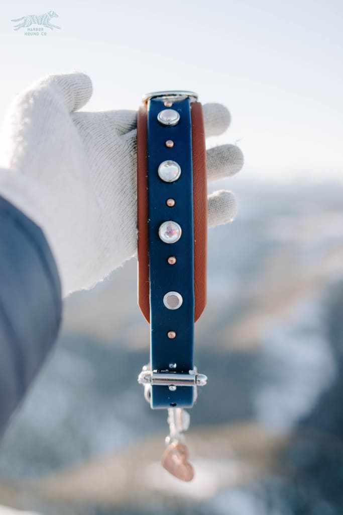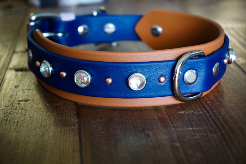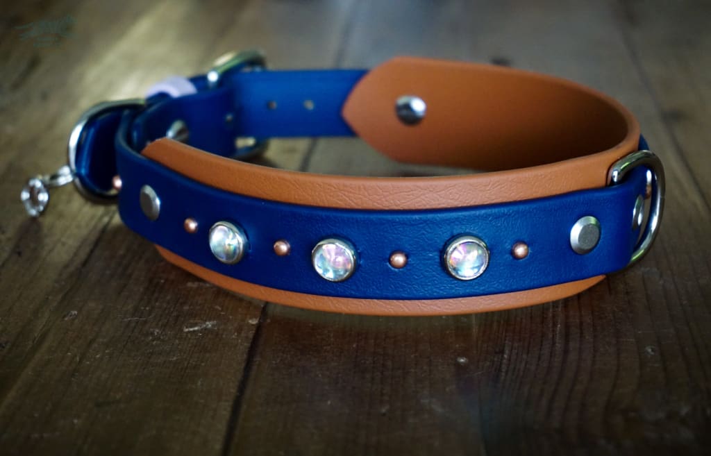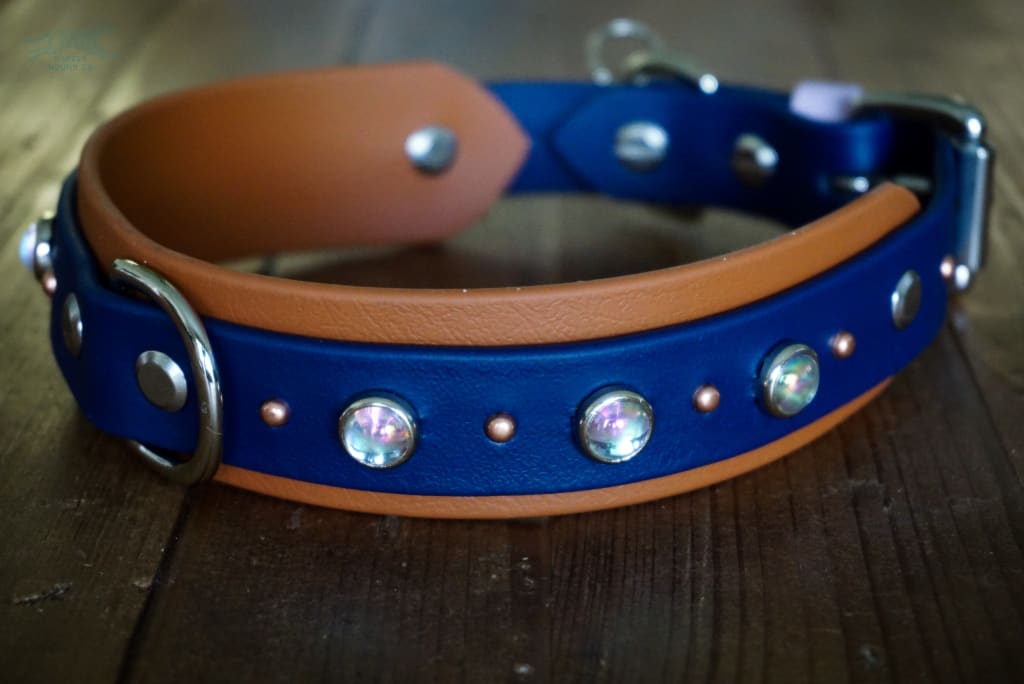 Pictured: Taliesin Style Collar with a 1″ Navy top collar layer, a 1.5″ Cognac bottom layer, Copper Round Metal Studs and Aurora Acrylic Jewels.
