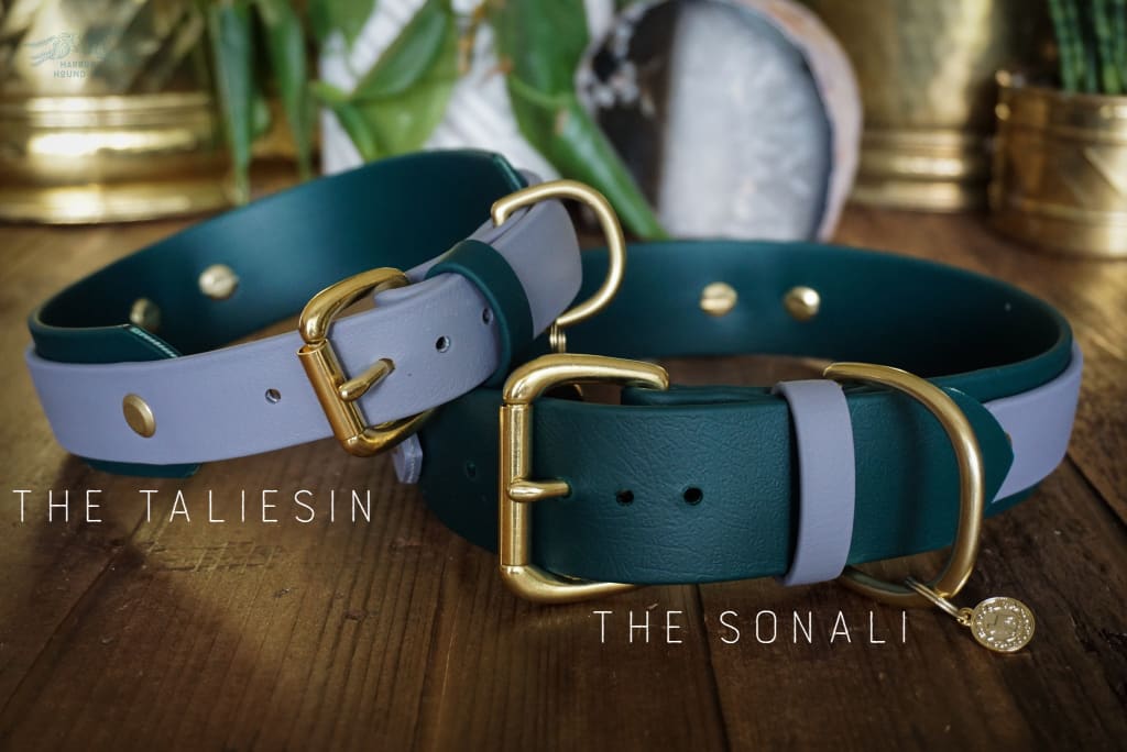 Sonali – 1.5″ wide base collar layer is the is the layer that your buckle will be on. The top layer is a decorative 1″ wide webbing layer. This style collar will fit larger necks better than the Taliesin.