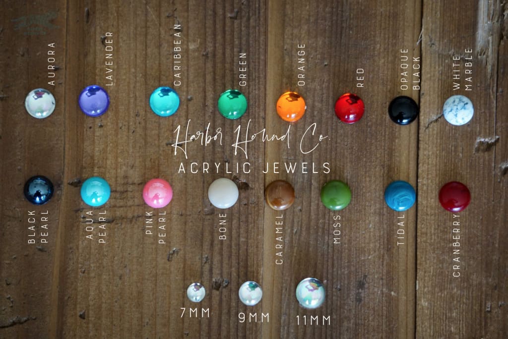 embellished with your color choice of metal round spots and beautiful 11mm Acrylic Jewels.