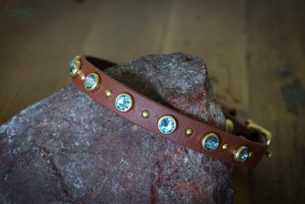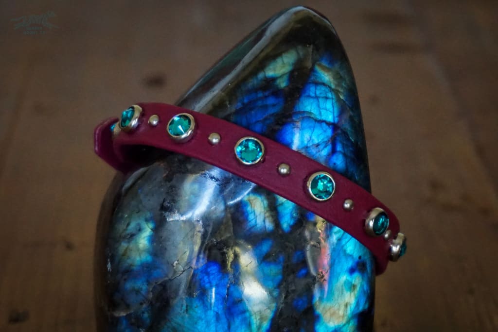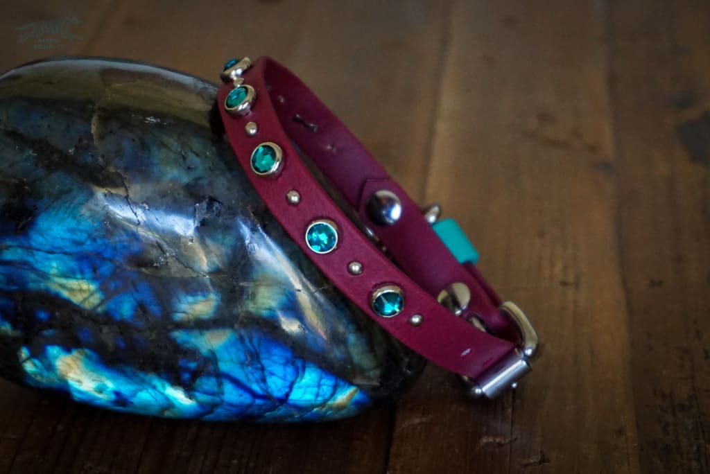 Pictured: 1/2″ Wine Collar with Silver studs & Blue Zircon Crystals